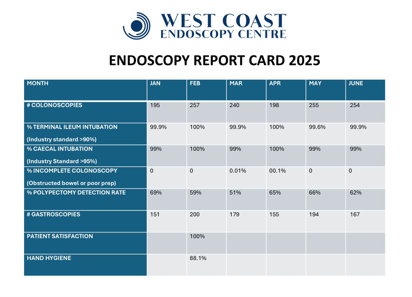 As a service to our referring doctors and patients we are proud to publish key clinical indicators of the quality of endoscopy at West Coast Endoscopy Centre. This is a feature unique to our practice and a key way of ensuring a quality service to your patients: